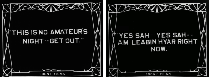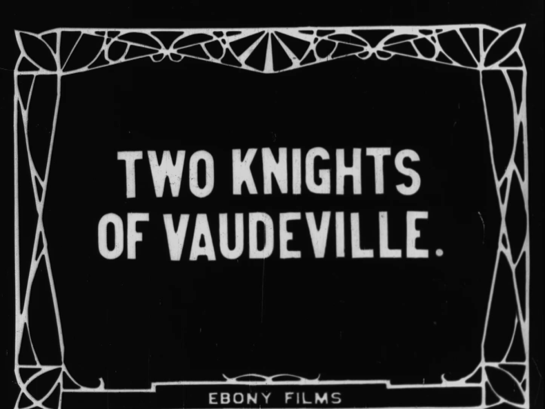 Der Film TWO KNIGHTS OF VAUDEVILLE (USA 1915) ist eine 11-minütige Slapstick-Komödie des frühen Schwarzen Kinos mit verworrener Produktions- und Distributionsgeschichte. Die opening credits des Films bestehen aus einer singulären, statischen Titelkarte (Clip 1). Ein zum Film selbst gehörender Abspann ist nicht erhalten; lediglich closing credits, die allerdings erst im Rahmen der vorliegenden Ausgabe, einer Publikation von Kino Lorber/BFI 100 Jahre nach der Erstveröffentlichung, ergänzt worden sind. In dem eröffnenden Insert findet sich neben dem mittig in großen Buchstaben präsentierten Filmtitel, unten eingelassen in die rahmende Verzierung der Tafel, eine weitere, weniger auffällige textliche Angabe: „Ebony Films“ – der Name einer Firma für Filmproduktion und -distribution (vgl. Header-Abbildung). Doch bereits ohne zu wissen, auf wen oder was sie sich bezieht, enthält diese Angabe einen anfänglichen Verweis auf ‚Race‘-Differenz. Denn „ebony“ heißt Ebenholz, ebenhölzern, tiefschwarz – Schwarz aber eben nicht nur als Farbe, sondern im Zuge von ‚Race‘, der Rassifizierung von Menschen. „Ebony“ ist ein ambivalenter Begriff, der sowohl als Fremdzuschreibung pejorativ – d.h. rassistisch – als auch als Selbstbeschreibung affirmativ verwendet wird, wie etwa im urban dictionary aufgefächert (N.N. o.J.).