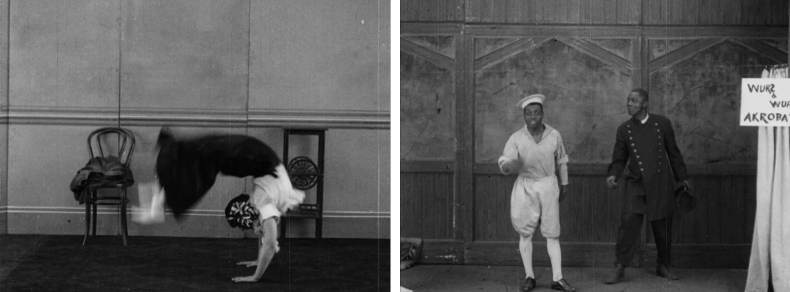 Wie der inhaltliche Verweis auf ‚Race‘ in THE SYMBOL OF THE UNCONQUERED zeigt (Abb. 2), tragen Zwischentitel erheblich dazu bei, dass diese Filme als „race films“ gelabelt werden. Das ist besonders prekär, wenn nicht geklärt ist, wer diese Zwischentitel wann eingefügt hat. In TWO KNIGHTS OF VAUDEVILLE wiederum findet sich der besagte „Ebony Films“-Credit in sämtlichen Zwischentiteln der erhaltenen Version und verstetigt diesen verzweigten Bezug insoweit. Zusätzlich vollzieht sich hier eine ebenfalls mehrdimensionale ‚Race‘-Differenzierung durch eine sprachliche Verschiebung zum Slang. Auslöser der Handlung des Kurzfilms ist der zufällige Fund von Tickets zu einem Varieté durch die Titelfiguren (Clip 1). Die Vorstellung besuchen die beiden gemeinsam mit einer Frau und einem Hund (die beide bezeichnenderweise aus dem Titel ausgeschlossen bleiben) (Abb. 3). Durch die Erfahrung des Varietés inspiriert, stellen die drei Protagonist*innen ein eigenes Vaudeville-Programm zusammen, in dem sie mitunter die Nummern des zuvor rezipierten Varietés (Akrobatik, Jonglieren) nachahmen (Abb. 4) und das im ausgelassenen Chaos endet (Clip 1). Die eigene Vorführung ist aber keine bloße Kopie der besuchten, sondern enthält Variationen und Ergänzungen. Sie lässt sich somit auch als Aneignung lesen – einschließlich einer noch stärkeren komödiantischen Überzeichnung. Insofern mag die zweite Darbietung eine Parodie der ersten darstellen, also als ambivalente „mimicry“ im postkolonialen Sinne Homi Bhabhas (1984) fungieren.