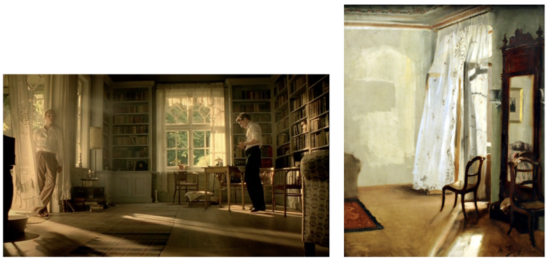 Der imaginative Modus lässt sich dabei auf verschiedenen Ebenen des Films verorten. Auf einer eher allgemeinen Ebene kann ich schlicht auf die bloße Tatsache aufmerksam werden, dass mich das Naturschöne eines Films an eine bestimmte Kunstform erinnert, etwa die Malerei. Dabei entdecke ich im Naturschönen allgemein malerische Qualitäten, die ich nicht genauer analysieren kann oder will. Auf einer etwas spezifischeren Ebene kann ich das Naturschöne durch die Linse eines bestimmten Genres der Malerei betrachten, etwa dann, wenn mich Literaturverfilmungen von James Ivory wie A ROOM WITH A VIEW/ZIMMER MIT AUSSICHT (UK 1985) oder HOWARD‘S END (UK 1992) an Landschaftsmalerei denken lassen. Noch konkreter wird es, wenn ich das Naturschöne im Film mit einem bestimmten Malerei-Stil verbinde, zum Beispiel wenn ich impressionistische Landschaftsbilder beim Betrachten von Jean Renoirs PARTIE DE CAMPAGNE/EINE LANDPARTIE (FRANKREICH, 1936/1946) vor Augen habe oder bei John Fords Western an die Hudson River School denken muss. Natürlich kann ich das Naturschöne im Film auch mit dem Blick auf eine*n ganz bestimmten Künstler*in betrachten: Manche Szenen in Stanley Kubricks BARRY LYNDON (USA 1975) sind bekanntlich den Landschaftsgemälden von John Constable oder Thomas Gainsborough nachempfunden, und die Repoussoir-Figuren, die in Céline Sciammas PORTRAIT DE LA JEUNE FILLE EN FEU/POTRÄT EINER JUNGEN FRAU IN FLAMMEN (FRANKREICH 2019) der vom Wind verwehten erhabenen Natur gegenüberstehen, erinnern nicht zufällig an Caspar David Friedrich. Schließlich kann ich auch ganz bestimmte Kunstwerke in einem Film entdecken, etwa wenn Akira Kurosawa in YUME/TRÄUME (JAPAN 1990) Vincent van Goghs Weizenfeld mit Krähen (1890) nachstellt oder ich mich in der Lesesaalszene in WAS NÜTZT DIE LIEBE IN GEDANKEN an Adolph von Menzels Das Balkonzimmer (1845) erinnert fühle (Abb. 4 und 5).