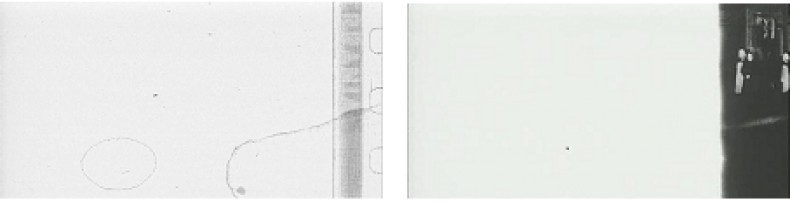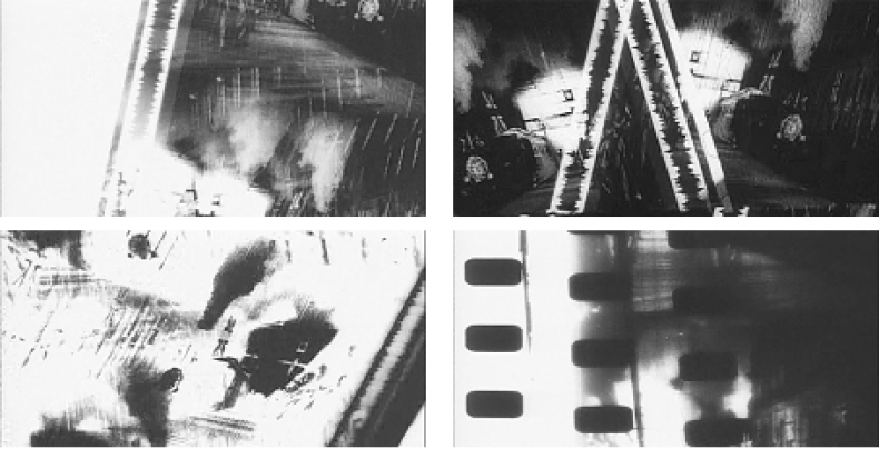 Zurück zu den Bildern von L’ ARRIVÉE: Ein Zug fährt ein, kollidiert mit seiner Spiegelung – und nicht der Zug, aber die Bilder seiner Einfahrt „entgleisen“. Die Ereignisse beginnen sich zu überschlagen. Tscherkassky lässt die Bilder aus ihrer sicheren Führung, mit anderen Worten, aus ihrer gewöhnlichen Projektions- und Sichtweise kippen. Einzelne Bildfragmente sind zu erkennen: Gleise, der Zug, Rauch. Und dann aber auch Fragmente des Filmstreifens selbst: Tonspuren, Perforationsstreifen, positiv wie negativ, verdoppeln und kreuzen sich, legen sich wie Schleier über das Bild. Genauer: das Filmmaterial selbst wird hier zum „Inhalt“ des Bildes, es wird Bild.