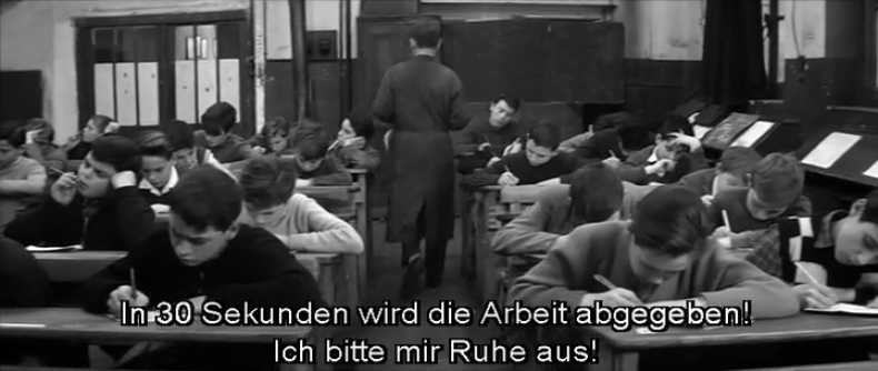 Nach der beschriebenen Aufnahme des von Hand zu Hand gereichten Bildes etabliert LES QUATRE CENTS COUPS die Grundzüge eines autoritären Schulunterrichts. Auf die Stimme des Lehrers, die aus dem Off in die Aufnahme der Schüler dringt und Antoine nach vorne ruft, reagiert die Kamera wie ertappt, indem sie hastig zum Lehrer schwenkt, der hinter dem Pult vor der Tafel thront. Sein Zeigefinger weist Antoine, den er als Unruhestifter ausgemacht hat, in die Ecke, ins Off des eigenen Blickfeldes. Mit dieser Geste der Zurechtweisung, sondert der Lehrer (auf Ebene der filmischen Handlung) den unbotmäßigen Schüler aus, und hebt (in Hinblick auf die Zuschauer*innen) den Protagonisten hervor. Später wird er an der Tafel ein Gedicht notieren, das er gleichzeitig vorliest, während die Schüler abschreiben müssen. Die Synchronität von Ton, Bild, Schrift markiert hier das durch den Unterricht legitimierte Zentrum der Aufmerksamkeit, auf das sich die Blicke der Schüler nur unter Zwang richten. Dieser Zwang wird nicht nur über die Stimme, sondern vor allem über den Blick des Lehrers ausgeübt. Eine Totale, die die schreibenden Schüler aus der Blickrichtung des Lehrerpults zeigt, ruft die panoptische Funktion der Raumordnung auf.12 Winfried Pauleit hat darauf hingewiesen, dass es sich dabei nicht um eine subjektive Lehrerperspektive, sondern um eine strukturelle Perspektive handelt. Sie veranschaulicht die Kontrollinstanz, die der räumlichen Organisation des Schauens innewohnt. Denn die Totale erscheint erst in dem Moment, indem der Lehrer seine Position am Pult verlassen hat, um die Bankreihen kontrollierend abzuschreiten. 13