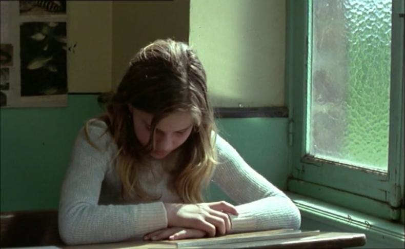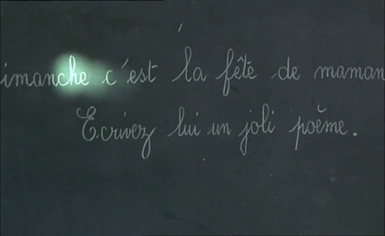 Von Anfang an wird damit eine Differenz etabliert zwischen der Schrift und dem Bild, zwischen der Stimme des Lehrers und den stummen Gesten der Schüler, zwischen dem Gegenstand des Unterrichts und dem, worauf sich die Aufmerksamkeit der Jungen richtet. Auch LA DRÔLESSE setzt mit dem vom Unterricht abschweifenden Blick ein. Wir sehen durch das Loch einer Scheibe auf einen Friedhof, auf dem eine Frau ein Grab pflegt. Erst im Anschluss wird dies als Blick eines Mädchens in einer Schulbank erkennbar. Das Mädchen beginnt mit einem Lineal zu spielen, das einen Lichtstrahl auf die Tafel reflektiert und dadurch die Aufmerksamkeit des Lehrers auf sich zieht. Sein Blick veranlasst sie, sich ihrem Schulheft zuzuwenden.