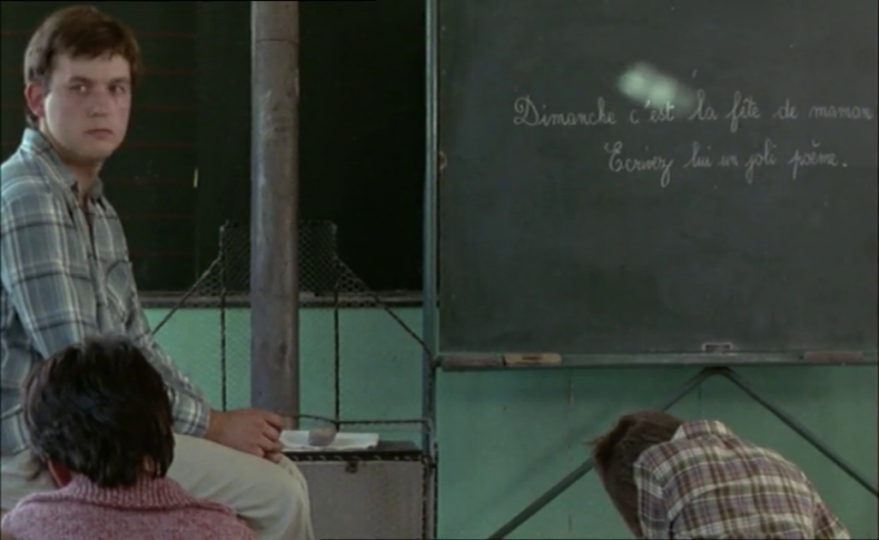 Die Kamera zeigt uns also zunächst das, was die Aufmerksamkeit der Schüler*innen weckt, schlägt sich auf ihre Seite. Sie folgt ihren Blicken und Gesten, die fremde Elemente in den Unterricht einführen. In LES QUATRE CENTS COUPS handelt es sich um ein Pin-Up, das unter den Schulbänken zirkuliert. Ein Bild der Populärkultur wird der von der Schule legitimierten Schriftkultur entgegengesetzt, die sich im Schulheft, später auch in dem Gedicht manifestiert, das der Lehrer an die Tafel schreibt. Der Protagonist Antoine Doinel tritt in dem Moment hervor, als er dieses Bild anmalt, die voyeuristisch dargebotene leicht bekleidete Frau mit einem Schnäuzer versieht. Winfried Pauleit hat diese (filmische) Geste als eine Parteinahme für ästhetische Bildung gedeutet. Die "bildkünstlerische Aktivität" des Schülers erinnere an die Strategien der Aneignung (und so möchte ich hinzufügen: Verfremdung) in der modernen Kunst.6 Sie reiht sich in andere "Gesten der Selbstermächtigung" ein, mit denen Antoine im weiteren Verlauf des Films versucht, sich als Individuum gegenüber den gesellschaftlichen Autoritäten zu behaupten – darunter ein phrasenhaftes Gedicht, dass er während der Pause an die Wand des Klassenzimmers schreibt.7 Laut Winfried Pauleit zeigt sich darin auch die Geste der Regie, die Suche des jungen François Truffaut nach Autorschaft, die dort beginnt, wo der sprachbasierte, autoritäre Unterricht scheitert.
