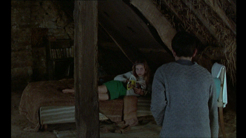 Mit der Videoattrappe reflektiert LA DRÔLESSE die Macht medialer Ordnungen, aber auch den Anteil der Regie an diesen. Er wirft die Frage auf, inwiefern die Filmkamera eine Apparatur der Kontrolle und die Regie eine Machtinstanz ist, die den Darsteller*innen ein bestimmtes Verhalten aufzwingt und damit gewissermaßen an die Stelle des Lehrkörpers tritt. Zugleich legt die Videokamera als Spielzeug auch eine andere Lesart nahe: als wäre der Regisseur selbst ein Spieler, der sich mittels der Kamera als dritter Instanz auf ein Spiel mit den Darsteller*innen einlässt. Das Spiel ist laut Giorgio Agamben ein Gegendispositiv: es kann die subjektivierende Macht der Dispositive durchbrechen, indem es deren Rituale reproduziert, aber ihrer ursprünglichen Sinnzuschreibung beraubt, indem es sie profaniert, in alltägliches Handeln überführt.20 In diesem Sinne brechen Doillon und seine Darsteller*innen die Macht medial vorgegebener Beziehungskonstellationen, indem sie diese im filmischen Spiel reproduzieren und variieren, um zu neuen Umgangsformen vorzustoßen. In der Mise en scène drückt sich diese spielerische Haltung in den Variationen der möglichen visuellen Anordnungen von Körpern und Dingen innerhalb des begrenzten Raums der Dachkammer aus.21
