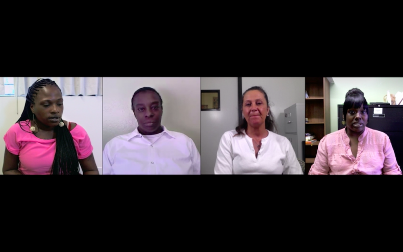 Parallel zur akustischen Betonung durch Sätze oder Begriffe, die überlagert und akustisch in den Vordergrund gesetzt werden, sind es die Einzelbilder der Splitscreens, die hervorgehoben werden. Die Vergrößerung einzelner Sprecher*innen ist dem optischen Design eines Skype-Gruppenanrufs nachempfunden, bei dem die Sprechenden auch in den Vordergrund rücken oder einzelne aus dem Bild fallen, wenn zu viele Teilnehmerinnen dazu geschaltet werden.2 Durch die alternierende Betonung werden Sätze durch mehrere Personen anteilig gesprochen, wenn diese einzelne Worte oder Satzteile daraus für ihr Statement verwendet haben. Es werden jedoch keine Sätze konstruiert, die nicht auch im Interview gesagt wurden. Einzelne Begriffe werden vielmehr chorisch verstärkt, um den Wiederholungsaspekt zu unterstreichen. Ein Satz kann so von mehreren Personen zugleich anteilig, überlappend oder komplett synchron gesprochen werden.
