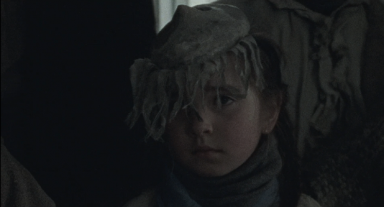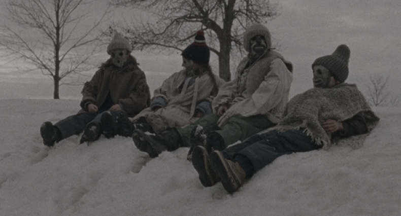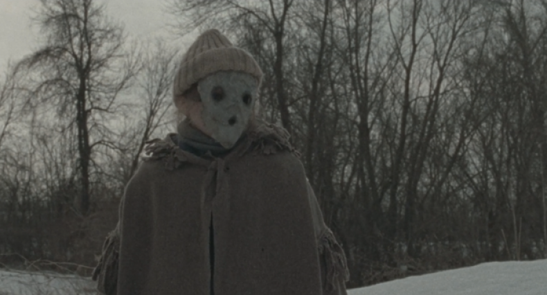 Die Kinder sind die einzigen Gespenster-Figuren im Film, die sich nicht allein über Passivität definieren, sondern über spezifische Handlungsweisen, die an ihre Aktivitäten im Leben erinnern mögen. Ihr erstes Auftreten ist wie erwähnt an den Tod Simons geknüpft, von dem sie scheinbar angezogen werden. Später sind sie immer wieder in kurzen unzusammenhängenden Einstellungen zu sehen, wie sie gemeinsam durch die Landschaft laufen oder an verlassenen Orten spielen und toben. In allen Szenen sind ihre Gesichter durch Masken und dicke Wollmützen verdeckt (Abb. 5). Diese Maskierungen heben sie visuell von den anderen Revenants ab, die im Verlauf des Films zu sehen sind. Sie markieren die Kinder einerseits als eigenständig gruppierte Agent_innen, die nicht der Ordnung der erwachsenen Toten angehören, andererseits treiben sie das unheimliche Spiel von An- und Abwesenheit weiter voran. Die Maske ist dabei selbst die paradoxe Form der Unterscheidung von An- und Abwesenheit, die im Sinne eines dritten Elements zwischen die Betrachter_in und das Subjekt tritt. Den Effekt der Maske und den Blick, den diese figuriert, beschreibt Derrida als grundsätzlichen „Visier-Effekt“ des Gespenstes (Derrida 2004: 21). Dieser besteht aus der „gespenstischen Dissymmetrie“ der Blicke, daraus, „dass wir uns gesehen fühlen von einem Blick, den zu kreuzen immer unmöglich bleiben wird“ (ebd.: 21–22). Die Maske verdeutlicht die Asymmetrie zwischen der, die die Maske trägt und der, die der Maske gegenübertritt. Dieses Ungleichgewicht bestimmt auch den epistemologischen Bruch zwischen den Revenants und den Dorfbewohner_innen insgesamt. Als Rückkehrer_innen aus dem Reich der Toten wissen sie, was nach der Überschreitung der Grenze kommt, ohne dieses Wissen zu teilen.