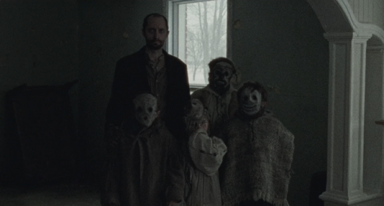 Das Schicksal der Kinder erschließt sich im Verlauf der Handlung weiter. Es findet sich eingebettet in die Geschichte des Café-Besitzers Pierre, der wie der Philosoph in der Geschichte von Plinius ein altes verlassenes Haus am Rande des Dorfes kaufen und renovieren möchte. Als er die Bürgermeisterin nach dem Haus fragt, rät diese ihm von dem Kauf ab – mit der Begründung, das Haus habe „schlechte Energie“. Sie berichtet ihm von dem vorherigen Besitzer, einem schwer depressiven Mann, der sich und seine vier Kinder im Haus umgebracht hatte. Pierre, der zunächst nichts auf diese Warnung gibt, wird später dem Geist des Vaters im Haus begegnen – und auch die Kinder bei ihm finden (Abb. 6a). Anders als der Philosoph in der Erzählung von Plinius verlässt er das Haus, ohne dem Grund für die Wiederkehr der Toten zu weiter nachzugehen, und sieht von dem Kauf ab. Seine Geste ist dabei unmissverständlich: Er überlässt den Toten ihr Haus und entschuldigt sich für die Störung. Wie als Dank für seinen Rückzug gewährt ihm eines der Kinder einen kurzen Blick hinter die Maske: Was sich hier offenbart, ist kein schreckliches Geheimnis, kein grausames Schicksal, das durch die Maske gnädig verdeckt wurde, sondern lediglich das Gesicht eines Mädchens, das überraschenderweise kein Zeichen des Todes trägt, sondern nur von einer ausdruckslosen Schwermütigkeit gezeichnet ist (Abb. 6b). Das ‚defacement‘, die De-Maskierung offenbart hier auf frappierende Weise, dass die Gespenster und die Lebenden sich kaum unterscheiden.
