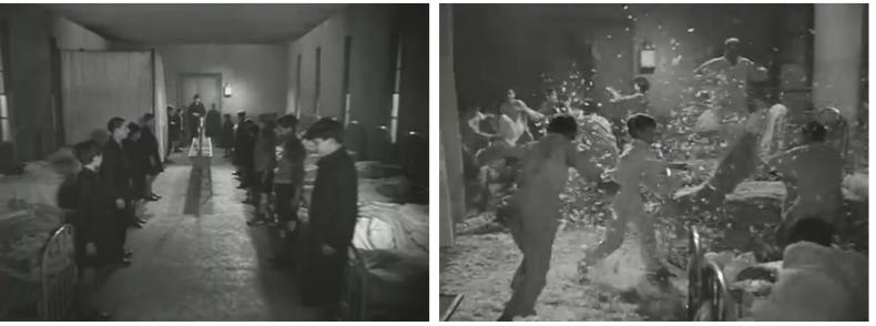 Da wäre zunächst die ‚Bewegtheit‘ zu nennen: Schon die Kissenschlachten des frühen Kinos inszenierten die chaotischen, unkontrollierbaren Bewegungen von Kindern. Auch in fiktionalen Filmen – wie in der anarchistischen Revolte der Schüler*innen in ZÉRO DE CONDUITE (BETRAGEN UNGENÜGEND, F 1933), die mit einer Kissenschlacht im Schlafsaal beginnt – destabilisieren solche Bewegungsfiguren Raumordnung und Bildlichkeit, lösen diese buchstäblich in Bewegungsbilder auf (Abb. 1–2). Die Revolte gegen die soziale Ordnung richtet sich hier auch auf Logiken der Bildproduktion, die sich auf der Tonspur fortsetzt, wenn diese in undifferenziertes Geschrei oder zerpflückte Klänge übergeht.
