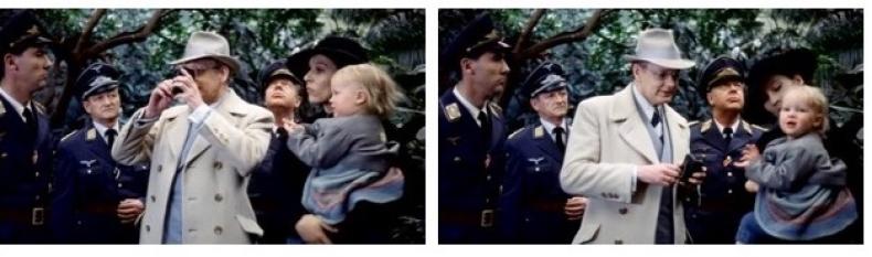 Schließlich kennzeichnet das ‚kindliche Schauspiel‘ auch in fiktionalen Filmen, wie Karen Lury unter anderem an BELLISSIMA (I 1951) gezeigt hat, eine Wandelbarkeit und Uneindeutigkeit, welche die Trennung zwischen Rolle und Sein infrage stellt (Lury 2010: 145-189). Die damit verbundene eigentümliche Präsenz von Kinderdarsteller*innen wird eingesetzt, um Fiktionen in der profilmischen Realität zu verankern, sie uns als gegenwärtig erscheinen zu lassen. Dies gilt gerade auch für Geschichtsfilme, wie DEUTSCHLAND, BLEICHE MUTTER (BRD 1980) oder LA MAISON DES BOIS (DAS HAUS IM WALD, F/I 1971), denen Kinderdarsteller*innen eine besondere Gegenwärtigkeit verleihen. Zugleich können Kinder die Mise en Scène dezentrieren, indem sie mit ihrem eigensinnigen Verhalten die Aufmerksamkeit vom Zentrum des narrativen Geschehens, von den bedeutsamen Handlungen Erwachsener ablenken (Abb. 5–6). Kinder fungieren in diesem Sinne auch als Fremdkörper im Getriebe des filmischen Erzählens, ihre Gegenwart durchkreuzt ideologische Absichten (Brodski 2016, Henzler 2022b).