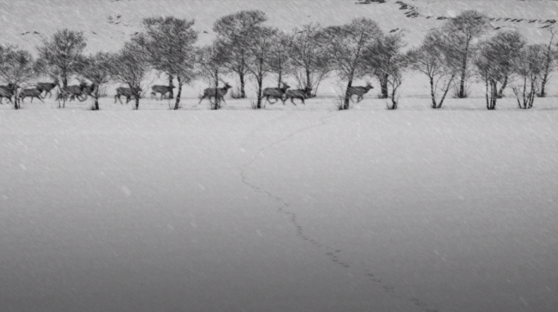 Einerseits scheint sich der Film 24 FRAMES als fotografisches Experiment wesentlich von den früheren und bekannteren Filmen Kiarostamis zu unterscheiden, beispielsweise von der sogenannten Koker-Trilogie WO IST DAS HAUS MEINES FREUNDES?/KHANEH- YE DUST KOJAST? (Iran 1987), UND DAS LEBEN GEHT WEITER/ZENDEHGI VA DIGAR HICH (Iran 1992) und QUER DURCH DEN OLIVENHAIN/ZIR-E DERAKHTAN-E ZAITUN (Iran 1994). Andererseits hat 24 FRAMES auch vieles mit ihnen gemeinsam, insbesondere die Panorama- und Endlos-Einstellungen in der Ästhetik des Cinema Vérité. Die scheinbare Nonchalance weckt die Neugier der Betrachter*innen und stimmt sie auf den vorübergehenden Moment ein, sogar auf das Wehen des Windes. 24 FRAMES greift außerdem Kiarostamis Faszination für die in einem Fahrzeug seitwärts fahrende Kamera auf (UND DAS LEBEN GEHT WEITER, DER GESCHMACK DER KIRSCHE/TA’M-E GILAS [Iran 1997] und TEN/DAH [Iran 2002]); in Frame 2 fährt die Scheibe hinunter, als der Wagen hält, und zwar um das Bild zweier im Schnee tollender Pferde einzufassen. Ähnlich blicken Frames 6, 12, 18, 20, 21 und 24 durch ein Sprossenfenster; sie erinnern an Kiarostamis Vorstellung von der Tür, die sich in WO IST DAS HAUS MEINES FREUNDES? zur Welt öffnet. Eine Parallele zum früheren Werk Kiarostamis liegt in der Horizontalität der Landschaft (die durch die seitwärts fahrende Kamera betont wird) und den von Wegen gebildeten Zickzack-Muster (wie in WO IST DAS HAUS MEINES FREUNDES? und QUER DURCH DEN OLIVENHAIN). Frame 4 beispielsweise zeigt zwei Baumreihen in der Ferne, an denen von links nach rechts eine Hirschherde entlangläuft; jedoch lenkt eine einzelne diagonale Tierspur im Schnee, die sich bis zu den parallelen Baumreihen zieht, den Blick in die Ferne [Abb. 1]. Des Weiteren spielt 24 FRAMES mit einer postmodernen Dichotomie zwischen Realität und Kunstschöpfung, wobei dies hier eher indirekt durch den bewussten Einsatz der digitalen Apparatur geschieht als durch die diegetische Figur eines realen (UND DAS LEBEN GEHT WEITER) oder erfundenen Filmemachers (CLOSE-UP/NEMA-YE NAZDIK [Iran 1990]).