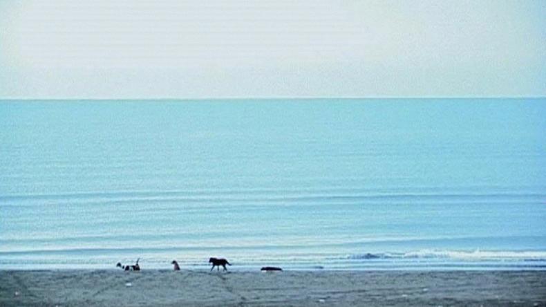 Entscheidend für die Frage nach einer Alleinstellung von 24 FRAMES innerhalb des Lebenswerks Kiarostamis ist der Vergleich mit seinem sehr ähnlich montierten Kompilationsfilm FIVE DEDICATED TO OZU (IRAN 2003). Er ist eine Zusammenstellung von fünf Kurzfilmen, von denen jeder wie eine Panorama-Aufnahme einer statischen Kamera wirkt, und zeugt ebenfalls von der Vorliebe des Regisseurs für Seelandschaften und Tierleben. Zum Beispiel, wie in Frame 16 filmt Kiarostami hier im vierten Kurzfilm Enten, die in den Bereich des Suchers gewatschelt kommen. Der dritte, 17-minütige Teil besteht aus einer einzigen Supertotalen von Hunden am Strand [Abb. 3]. In einem Kurzfilm, der auf der DVD von FIVE enthalten ist, erklärt Kiarostami, dass diese Szene keinem Plan folgte: Seine Rolle war es, „keine Rolle zu haben“. Als er die Kamera einschaltete, herrschte absolute Dunkelheit, am Meeresufer war nichts zu sehen, und er schlief ein. Was seine Kamera einfängt, sind sechs aufwachende Hunde, ihre Silhouetten bewegen sich zwischen Uferlinie und Wasser. Im Verlauf der Aufnahme „vereinigen sich“ die Horizonte; Meer, Erde und Himmel „werden ein Raum. Die Wellen werden zu Meerwesen, und alles bewegt sich auf eine totale Nichtexistenz zu, und mitten aus dieser Nichtexistenz heraus scheint eine neue Existenz auf.“ – „Vor unseren Augen wird alles vollständig ausgelöscht … Alles bewegt sich auf reine Helligkeit zu, zerfließt dann und wird ausgelöscht.“ Bezüglich der Hunde sagt Kiarostami: „Mir war nicht klar, dass sie ihre Gefühle sehr viel authentischer ausdrücken, als wir ahnen. Mein kleiner Whippet hat sich den Film sehr intensiv angeschaut, obwohl die Hunde darin nur winzige Silhouetten am Horizont sind.“ Vielleicht hat er wie Kiarostami ihr Schwanzwedeln als ein „Guten Morgen“ oder „Was für ein schöner Tag“ oder auch „Hast du gut geschlafen?“ verstanden. Das in dem Film dargestellte liebevolle Miteinander im Rudel, in der Herde oder im Schwarm zieht sich auch durch 24 FRAMES.