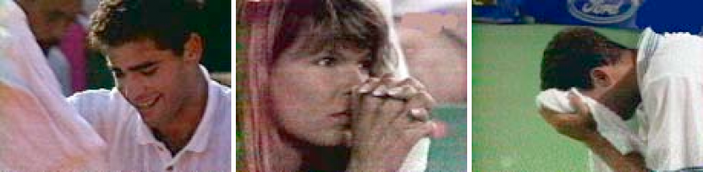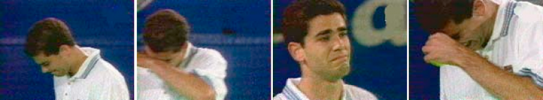 Viertelfinale der Australian Open 1995. Gegen Ende des vierten Satzes schlägt Jim Courier (gegen Pete Sampras) einen einfachen Schmetterball ins Netz. Die Stimme des Kommentators Volker Kottkamp bleibt konzentriert und nüchtern: "das sieht man selten, dass ein Überkopfball von einem Weltklassespieler so verzogen wird". Seine Ausdeutung der psychischen und physischen Verfassung der Spieler trägt zur Erklärung des Spielgeschehens bei: "zweiter Satzball für Sampras, der im Moment mit dem Druck von Jim Courier besser fertig wird". Parallel dazu fordert die routinierte Abfolge der Kameraeinstellungen eine sorgfältige Beobachtung und Bewertung von Gestik und Mimik einer Vielzahl von Akteuren heraus, die sich um das Spielgeschehen anordnen. Vor dem Aufschlag die Großaufnahmen der Kontrahenten. Sampras ist ruhiger, stoischer als Courier; wie immer sieht man seine Zunge zwischen den Lippen. Nach einem misslungenen Schlag von ihm sehen wir erst ihn, dann seine Freundin mit Gesten des Ärgers oder Entsetzens. Nach dem gescheiterten Schmetterball Couriers sehen wir eine Nahaufnahme von Sampras' Freundin, die ekstatisch jubelt. Der Schnitt zurück auf die Spieler zeigt eine etwas gedehnte Pause vor dem folgenden Aufschlag; mehrere Blicke auf das müde und angespannte Gesicht von Sampras. Ich würde gerne ausführlicher in dieser Mimik 'lesen', aber in der standardisierten Montage des Fernsehtennis folgt jetzt ein längerer Blick auf den Gegner Courier. Schneller Punktgewinn für Sampras; jetzt sehen wir wieder ihn beim Aufschlag, er verzieht sein Gesicht. Halbnahe Einstellung, endlich bleibt die Kamera wieder etwas länger bei Sampras. Er wischt sich mit einer Hand über den Mund, wischt sich mit dem Oberarm des anderen Arms über das Gesicht. Die Kamera springt kurz zurück: im Vordergrund Courier, im Hintergrund Sampras; zum Glück wechselt die Einstellung schnell wieder zu einer näheren Aufnahme von Sampras. Vielleicht mutmaßt das Fernsehen, was ich mutmaße. Sein Mund ist ganz deutlich verkrampft; nochmal ein Wischen mit dem kurzen Ärmel des Shirts über den Mund; Sampras dreht sich von der Kamera weg und drückt nochmals den rechten Oberarm an sein Gesicht, er dreht sich wieder in Richtung Kamera, und zieht einen Zipfel des Shirts aus dem Schulterbereich hoch, um sich damit über das Auge zu wischen. Gegenschuss zu Courier, der sich mit der Hand den Schweiß vom Gesicht wischt; etwas ungeduldig spielt er am Schläger herum. Und noch einmal wird zurück zu Sampras geschnitten. Augen und Mund verraten nun eindeutig: Sampras weint. Dennoch schlägt er jetzt auf – Return-Winner für Courier. Endlich eine Großaufnahme von Sampras' nassem Gesicht. Sie wird aber sofort von einer Zeitlupenwiederholung des Aufschlags unterbrochen. Die Kamera ist so hinter Sampras positioniert, dass wir die Ausführung des Aufschlags kontrollieren können; sie ist an rein sportlichen Kriterien orientiert, die mich jetzt nicht mehr interessieren. Sampras weint während des Spiels; aber nur ganz zögerlich durchbricht das Fernsehen die für das Tennis vorgesehene Découpage ...