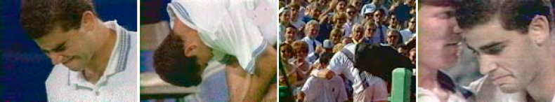 ... eine Zeitlupe mit dem Aufschlag von Sampras. Dieser macht ohne weitere Unterbrechungen den nächsten Punkt (währenddessen eine Schrifteinblendung: "im Anschluß folgt das Damendoppel"). Dann eine Amerikanische Einstellung, wie Sampras von rechts nach links und wieder zurück durchs Bild läuft, das Gesicht in die Armbeuge begraben; die Profil-Großaufnahme von der Gegenseite (Achsenprung) lässt ein weinendes Zucken und ein verzerrtes Gesicht sehen. Sampras macht ein Spiel (Stand: 6-7; 6-7; 6-3; 6-4; 1-0). Jetzt erst konzentriert sich die Kamera fast ausschließlich auf ihn; die Bildregie führt die Verlagerung in der Hierarchie der beiden Ereignisse ein, die sich in der folgenden kurzen Pause entfaltet. Sampras geht zu seinem Stuhl, bedeckt seinen Kopf mit dem Handtuch, zieht es wieder herunter; kurz sieht man sein weinendes Gesicht, das er dann im Handtuch begräbt. Der Kommentar weigert sich noch, dem Konkurrenzereignis Rechnung zu tragen: "Immer wieder interessant zu beobachten […], wie Spiele sich wandeln […]." Kurz darauf hören wir aber ein zögerndes Eingeständnis: "und nun erleben wir einen – ja, ich würde fast sagen – weinenden Pete Sampras"; ein Eingeständnis, das – hierin ganz den Verfahren der Sportberichterstattung folgend – jedes Teilereignis in eine bio-historiografische Kette einzubinden versucht: "vielleicht denkt er an seinen Trainer, der mit einer Herzattacke hier ins Krankenhaus eingeliefert werden musste und der mittlerweile in die USA zurückgeflogen ist; lassen wir das Spekulieren und lassen wir diese Bilder einfach für sich sprechen; Pete Sampras, der eine enorme Energieleistung vollbracht hat […]" Während der Reporter weiter die vergangenen Spiele Sampras' Revue passieren lässt, erhält dieser etwas Wasser aus einer Plastikflasche, wischt sich damit das Gesicht; der O-Ton "Time" ist vom Schiedsrichterstuhl zu hören. Die Kamera folgt zum ersten Mal wieder Courier und findet zum Teil zu den ästhetischen Verfahren des Fernsehsports zurück; allerdings gibt es nun ein kurzes Replay vom weinenden Sampras auf dem Pausenstuhl. Während der nächsten Ballwechsel zeigt die Kamera durchgehend Sampras. Während im Off eine Verwarnung gegen Courier ausgesprochen wird, zeigen sich bei Sampras wieder Anzeichen für das Weinen. Courier gewinnt das Spiel; in einer etwas längeren Pause vor dem nächsten Aufschlag läuft Sampras über den Platz und beugt sich weit nach vorne. "Bilder, wie ich sie in dieser Form noch nie erlebt habe während eines Tennisspiels" äußert der ansonsten sehr zurückgenommene Kommentar. Zum ersten Mal nach langer Zeit sehen wir Sampras' Freundin kurz mit versteinerten Gesicht. Nach dem nächsten Ballwechsel sehen wir sie in einem sichtlich besorgten Gespräch mit zwei anderen Frauen. Auch die relationalen Bilder beziehen sich jetzt eindeutig nicht mehr auf das Sportereignis, sondern lassen uns Reaktionen auf das Konkurrenzereignis sehen.