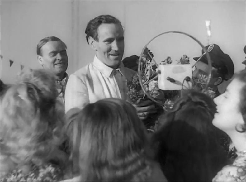 Anknüpfend an den großen Publikumserfolg QUAX, DER BRUCHPILOT (1941) wechselte Heinz Rühmann in QUAX IN AFRIKA (1943-44/47) die Seiten. Der undisziplinierte Flugschüler Otto Groschenbügel ist zum strengen Fluglehrer aufgestiegen. Als er sich dann noch für den „Europaflug“ – einen wichtigen internationalen Wettbewerb – mit einigen Fliegerinnen zusammentun muss, sind die Konflikte vorprogrammiert. Nach einem Absturz in Afrika liegen alle Hoffnungen auf dem ehemals aufmüpfigen Flugschüler Fips. Groschenbügel und seine Copilotin Renate Scholl (Hertha Feiler) lauschen an einem improvisierten Radioempfänger einer Liveübertragung des Zieleinlaufs.