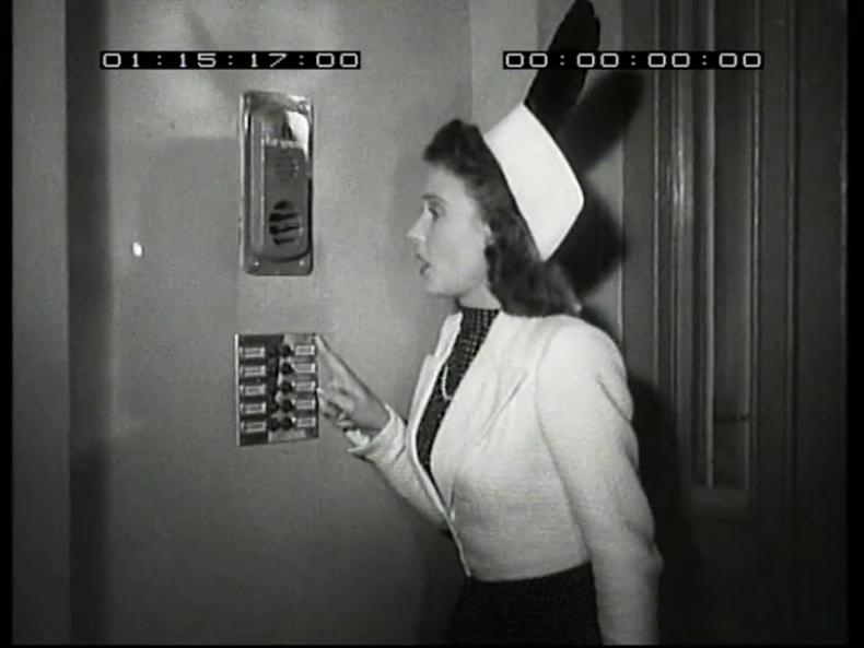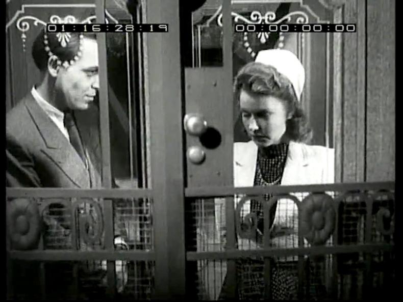 Zwei Fremde haben es auf dieselbe Wohnung zur Untermiete bei einem älteren Herrn abgesehen. Da weder Jürgen (Paul Klinger) noch Marianne (Karin Hardt) kleinbeigeben wollen, behaupten sie kurzerhand, ein Ehepaar zu sein und ziehen beide ein – so die Ausgangssituation in VIER TREPPEN RECHTS (1944-45/50). Auf einige komödiantische Kämpfe folgen zuerst die große Liebe, später Streit und Trennung. Doch Marianne vergisst ihr Geld und muss noch einmal zurück in die gemeinsame Wohnung. An der Gegensprechanlage lässt sich Jürgen durch den alten Vermieter verleugnen, um Marianne nicht zu verschrecken.