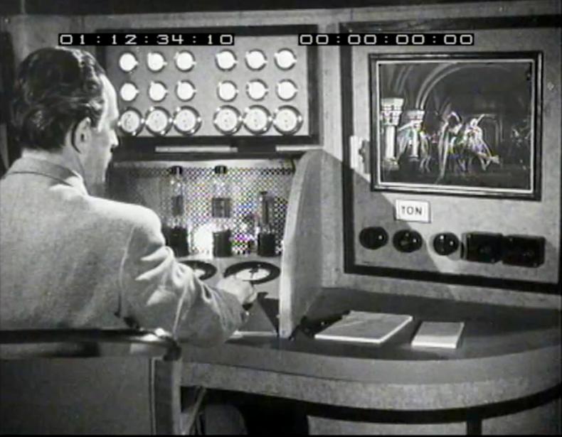 Eine junge Frau (Margot Hielscher) und ihre Begleiter – darunter der junge Architekt Robert (Albert Matterstock) – suchen in einem alten Gemäuer Schutz vor einem Gewitter und erleben allerlei Geistererscheinungen. Doch der SPUK IM SCHLOSS (1943-45/47) erweist sich als technische Konstruktion. Der vermeintliche Schlossherr ist ein geschickter Illusionist, der mithilfe von Infrarotstrahlen hologrammartige Bilder erzeugt, die gleichzeitig vertont werden. Am Ende des Films wird der Prozess der Ton-Bewegtbild-Produktion im Rahmen einer Theaterrevue vorgeführt. Der Film bedient sich hierbei verschiedener Überblendungseffekte aus der Frühzeit des Kinos und kombiniert sie mit Toneffekten, deren Erzeugung mithilfe der Darstellung eines Technikers am Mischpult sichtbar gemacht wird.