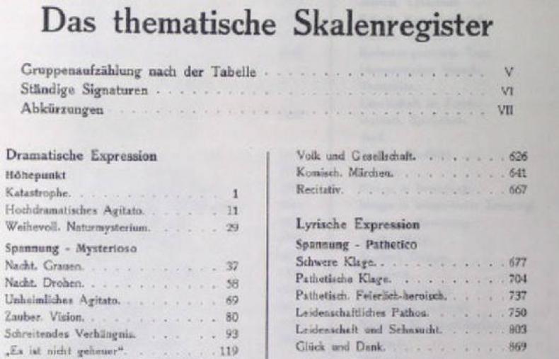 Mit den raschen Umwälzungen im Filmgeschäft und in der Filmproduktion (in Bezug auf Länge und Komplexität von Filmen) wurde es im Laufe der 1920er Jahre notwendig, dass die Kapellmeister in den Kinos nicht mehr mit Zettelkästen arbeiteten, um Noten zu archivieren und Musik für Filme auszuwählen. (Vgl. Erdmann, Becce & Brav 1927: S. 58) Sie sollten ihre künstlerische Intuition sinnvoll nutzen können, indem sie einer bestimmten Ordnung folgten. (Ebd.: S. 38) Die Autoren des Handbuchs wollten eine solche Ordnung herstellen und gehen in ihrem „thematischen Skalenregister“ von drei grundsätzliche Musik-Kategorien aus: „dramatische Expression“, „lyrische Expression“ und die „Incidenzmusik“. (Ebd.: S. 40-41) Bei der Incidenzmusik handelt es sich um Musik für bestimmte Anlässe, die mit der Handlung verknüpft sind, z.B. Märsche, Tänze oder Lieder.49 Dazu können in einem Film verschiedene Arten von Spannungen auftreten: (1) Tiefpunkt (geringste Spannung) – wie im Fall von Monotonie, Melancholie, Resignation oder Traum und (2) Höhepunkt (höchste Spannung). Beim Höhepunkt sind zwei Arten zu unterscheiden: den mehr „schildernden“ Höhepunkt mit Charakteristiken wie Katastrophe, Hochdramatik, Naturmysterium und den „Appassionato-Höhepunkt“ mit Ausprägungen, wie Verzweiflung, Leidenschaft, Jubel. Zwischen Tiefpunkt und Höhepunkt liegen verschiedene Spannungsgrade, die sich bei der dramatischen Expression in „Mysterioso“ (geheimnisvoll) und „Agitato“ (unruhig, bewegt) einordnen und bei der lyrischen Expression als „pathetisch“ (feierlich, gefühlvoll). (Erdmann, Becce & Brav 1927: S. 40-41)