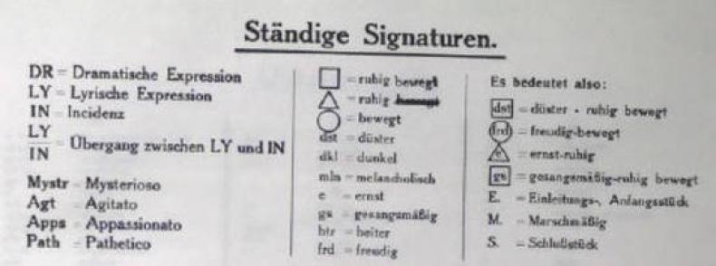 Zusätzlich wird davon ausgegangen, dass ein Musikstück durch die Bewegung (Tempo und Rhythmus) gekennzeichnet ist. Das Handbuch arbeitet daher außerdem mit verschiedenen Skalen. Eine der Skalen nimmt drei Bewegungsgrade auf: ruhig, ruhig-bewegt, bewegt (mit Formen Dreieck, Quadrat und Kreis bezeichnet); eine weitere Skala Tönungen: düster, dunkel, ernst, heiter, freudig.52 Die Zeichen für die Tönungen und Bewegungsgrade finden sich an den Noten im zweiten Teil des Handbuchs (s. Abb. 7).