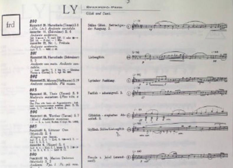 Durch das thematische Register konnte der Komponist eine Nummer ermitteln, die wiederum auf eine entsprechende Gruppe von Notenstücken im zweiten Teil des Handbuchs verweist (s. Abb. 6 und Abb. 7). Beispielsweise ist unter Lyrischer Expression und pathetisch in der Gruppe für „Glück und Dank“ (Nr. 869-902) unter Nr. 895 ein Notenstück einer Ouvertüre von Amilcare Ponchielli (1834-1886) aufgeführt50 und mit „idyllisch“ näher beschrieben (vgl. Abb. 7).