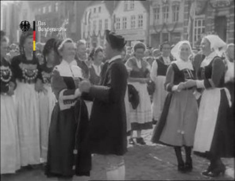 Die Wochenschau setzte Musik unbestreitbar geschickt ein, wie das folgende Beispiel der ersten Beiträge von Ausgabe Nr. 19 der Neuen Deutschen Wochenschau (NDW)4 vom 6. Juni 1950 zeigen soll.5 Nach der typischen Titelmusik und dem Titelbild beginnt der erste Beitrag mit einem Orgelpräludium von Bach. Auch ohne den Zwischentitel „Regensburger Domspatzen“ hätte man erraten können, dass es nun um etwas Geistliches geht: Die Chorknaben, die als ‚engelgleiche Botschafter für Deutschland‘ von einer Tournee durch die Schweiz zurückgekehrt waren, singen im O-Ton vor der mittelalterlichen Fassade des Doms. Der nächste Beitrag wird mit einer Fanfare angekündigt, während die Schrift „Interview der Woche“ als Zwischentitel über dem Motiv der Londoner Tower Bridge zeilenweise erscheint. Der zukünftige britische Hohe Kommissar, Ivone Kirkpatrick, steht zunächst vor einem Fenster, das im Hintergrund eine Bogenfassade aufscheinen lässt (korrespondierend zur Fassade des Doms im vorherigen Sujet). Dann spricht er am Schreibtisch zum Anlass seiner Amtsaufnahme zu seinen „deutschen Freunden“. Den Übergang von diesem eher politischen Teil zum unterhaltsamen Teil bildet ein Beitrag über Rothenburg ob der Tauber. Bereits mit dem Beitragstitel mit der geschwungenen Schrift „Aus einer kleinen Stadt“ setzt die zarte Streicher-Melodie eines „Altniederländischen Tanzes“ ein. Die Musik passt zu den mittelalterlichen Häusern des Stadtpanoramas und einer Schauspielszene zu Ehren des Gastes – des amerikanischen Hohen Kommissars John McCloy. Wie der Kommentar erklärt, hat er im Zweiten Weltkrieg als Artillerie-Kommandeur die Stadt vor der Zerstörung bewahrt. Nun folgt kein Zwischentitel, sondern ein musikalischer wie visueller Schlusspunkt.