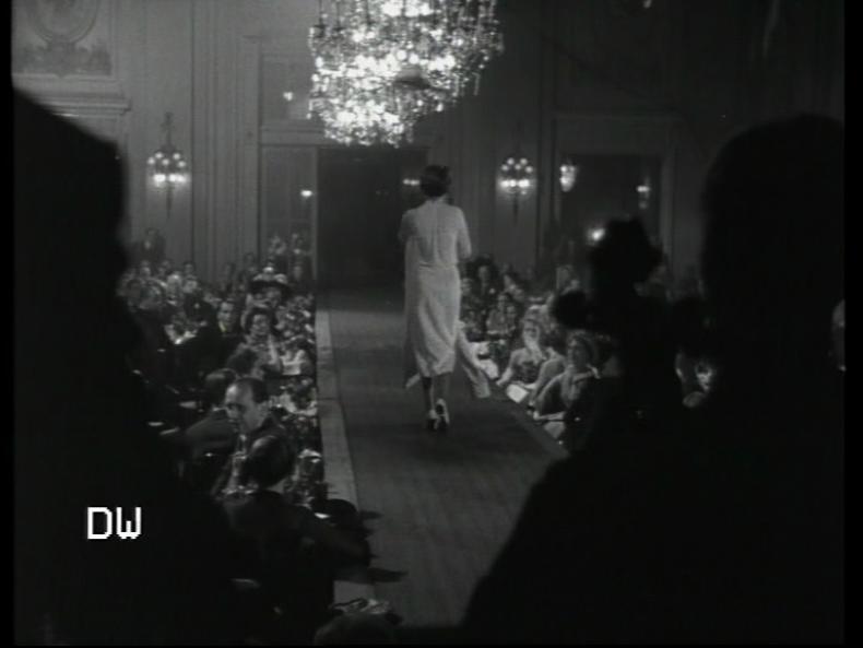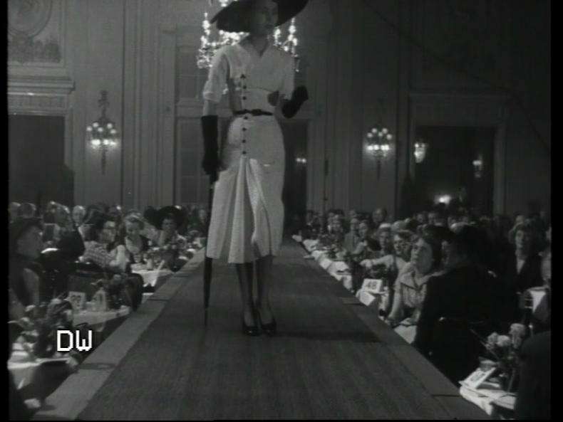 Unvermittelt einsetzende jazzige Klänge und das Bild des nächtlich beleuchteten Hamburger Hotels Atlantic in Untersicht kündigen etwas Extravagantes an. Die Frauenstimme des Kommentars6 braucht nur wenige einleitende Worte, um diesen Eindruck zu bestätigen: „Hamburgs Welthotel Atlantic – Jacques Fath. Der große Pariser Modezauberer schickte uns seine schönsten Mannequins mit den traumhaften Schöpfungen seiner Phantasie […]“. Die Musik unterstützt beim Schnitt in das Hotelinnere das Eintauchen in das glamouröse Ambiente von Kronleuchtern und den neuesten Modellen auf dem Laufsteg. Die Schau ist mit dem Stück „Put the Blame on Mame“ aus dem Spielfilm GILDA (R: Charles Vidor, US 1946) unterlegt; die Hauptrolle spielte Rita Hayworth. Es ist davon auszugehen, dass viele Zuschauer diese Musik kannten7 sowie auch die ‚anrüchige‘ Szene des Films, in der die Hayworth das Lied singt. Sie trägt dabei lange schwarze Handschuhe – ebenso wie das erste Modell der Modenschau (s. Abb. 2 und Abb. 3).