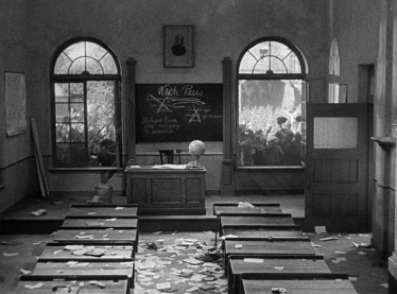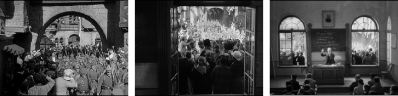 Die Szene endet schließlich damit, dass sich die Jugendlichen im ausbrechenden Tumult zu einem Marsch formieren, der mit dem Lehrer als Anführer aus dem Klassenzimmer hinaus auf die Straße führt und in dem jene räumlich-ideologischen Grenzen zwischen kriegseuphorischem Treiben auf der Straße und dem schulischen Lehrraum aufgehoben werden. Der Raum, der sich konsequent anschließt und sich sowohl den Schülern als auch den Zuschauern in der anschließenden Szene bildlich eröffnet, ist die Kaserne, in der die Ausbildung nun explizit militärisch-nationalistisch konnotiert ist.