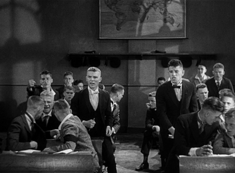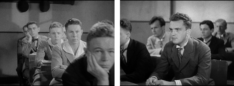 Die sich entspinnende Rede des Lehrers adressiert die Schüler als Masse, die an diesem Punkt der Narration auch dem Filmbetrachter noch nicht als Individuen bekannt sind. Die rhetorisch und architektonisch konstituierte Zuhörerschaft besteht somit in einer weitgehend homogenen Schülergruppe. Die Anordnung der symmetrisch gereihten Sitzbänke lässt ebenso wie die uniformen, gleichsam geometrisch montierten Kameraeinstellungen von gleichförmig frisierten und gekleideten Schülern kaum Raum für Individualitäten. So, wie der Lehrer immer wieder auf einzelne Schüler namentlich eingeht, zeigt auch der Film einzelne Gesichter der adressierten Schüler, die jedoch in die Gruppe eingepasst und gemeinsam zu dieser geformt werden. Das Individuum wird als Teil einer Masse adressiert, welches Kantoreks rhetorischer Logik des „And You“ entspricht.17