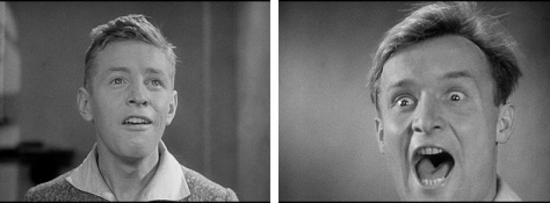 Jedoch deutet sich bereits in dieser frühen Schulszene an, dass die schulischen Raum- und Machteffekte nicht ganz bruchlos in die kinematografisch-dispositiven übergehen, dass die Stimme, Intention und Wirkrichtung des Lehrers zwar den Handlungsraum Schule, aber nicht in gleicher Weise den Bildraum des Films und den Rezeptionsraum des Kinos bestimmen. So klingt die Rede des Lehrers in Inhalt und Ausdruck doch stark übertrieben. Sein Gesicht erscheint in extremer Nahsicht, die seine geradezu fanatische Gestik und Mimik bloßzustellen scheint.