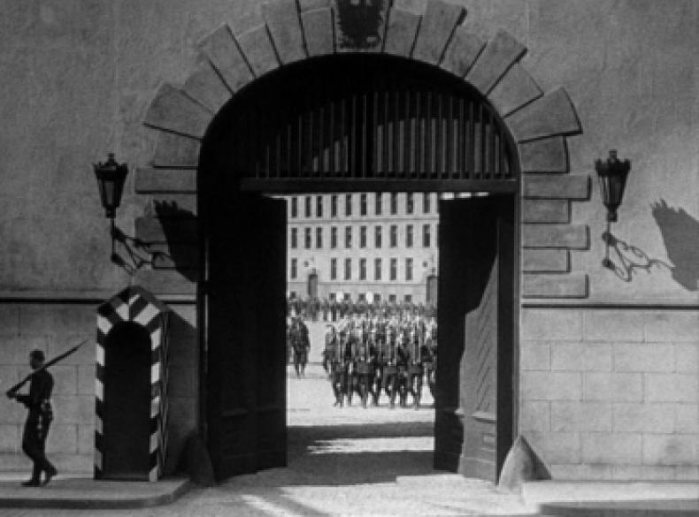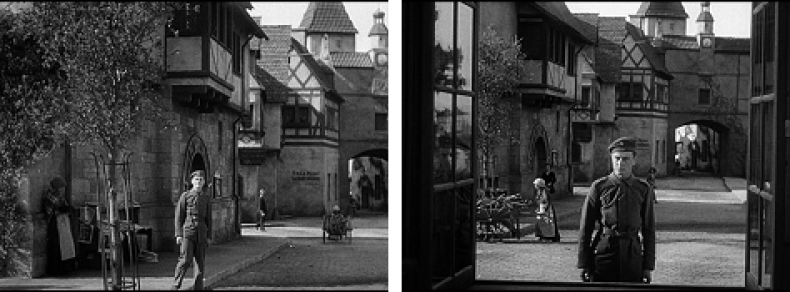 Der Film beginnt mit einer Militärparade auf den Straßen einer nicht näher spezifizierten deutschen Stadt. Soldaten ziehen unter dem Jubel zahlreicher Zuschauer und begleitet von euphorischer Marschmusik in den Krieg. Diese Ansicht geht scheinbar übergangslos ohne Schnitt in eine Handlungsszene über. Während die Kamera langsam zurück fährt, wird ein Fensterrahmen erkennbar, der nun die Straßenansicht als Ausblick aus einem ebenerdigen Gebäude erkennbar werden lässt.