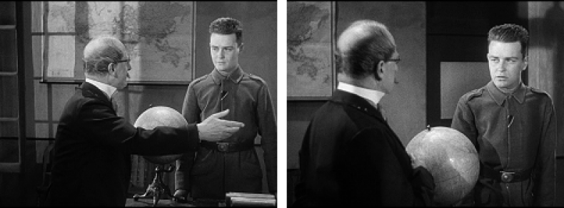 Das Klassenzimmer und der (kinematografische) Rezeptionsraum sind nun nicht mehr Räume absoluten, unhinterfragten Wissens, des ordnenden Überblicks und einseitiger Macht- und Blickstrukturen. Es finden sich keine autoritär geometrisch kanalisierten Bildkompositionen und kein symmetrisch arrangierter Überblick. Die Gesprächssituation sowie die Weltkarte im Hintergrund werden durch Schattenwürfe des Fensterkreuzes gleichsam „überschattet“ und räumlich verkompliziert; der Text an der Tafel im Hintergrund ist verwischt und hinterlässt eine graue heterogene Struktur, die nun Paul Bäumers Formulierung „I can’t tell you anything“ zu illustrieren scheint und die Auslöschung der Schrift als Ausdruck eines autoritären Diskurses veranschaulicht.
