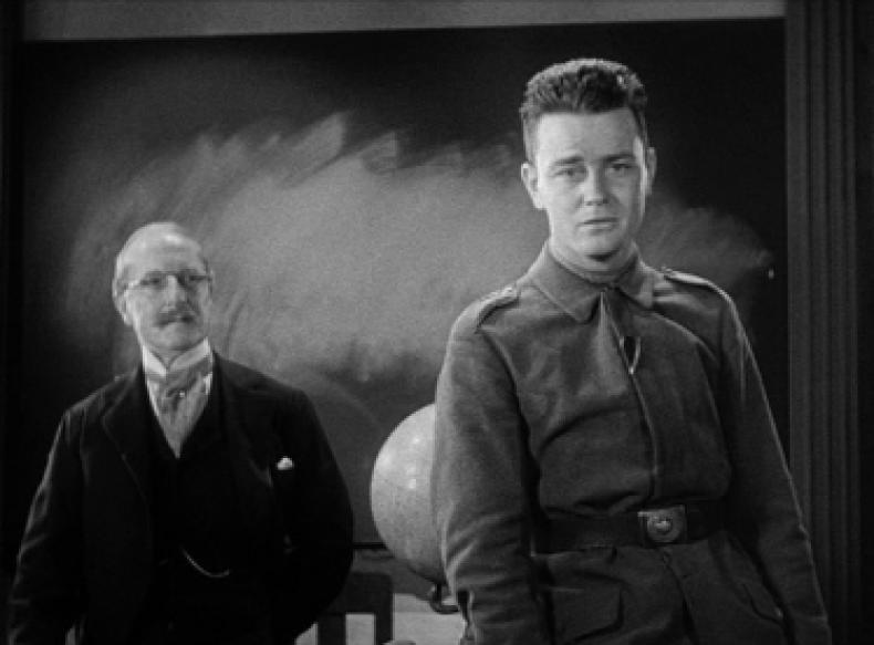 ALL QUIET ON THE WESTERN FRONT wählt den Handlungsort des Klassenzimmers an zwei zentralen Wendepunkten der Handlung: Zu Beginn des Films motiviert der Lehrer im Zuge einer allgemeinen nationalen Kriegsbegeisterung seine Schüler zum Militärdienst. Eine parallel strukturierte Szene findet sich gegen Ende des Films, als der Protagonist Paul Bäumer während eines Fronturlaubs seine ehemalige Schule besucht und im Unterricht desillusioniert von seinen Kriegserfahrungen berichtet. In diesen beiden Szenen bilden und manifestieren sich jeweils die ausschlaggebenden Entscheidungen der Protagonisten und konkretisieren sich die Haltungen zum Krieg. Der dramaturgischen Entwicklung entsprechend formieren sich in diesen beiden Szenen und ihren Inszenierungen entgegen gesetzte Vorstellungen von Krieg und Nation und darüber hinaus unterschiedliche Konzepte von Schule, Film, den Beziehungen zwischen ihren jeweiligen Instanzen (Lehrer-Schüler, Film-Zuschauer) und ihren vermittelnden Strategien und Potenzialen.