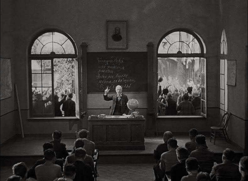 Bald wird deutlich, dass es sich bei diesem vorgelagerten Raum um ein Klassenzimmer mit zwei überdimensional großen, geöffneten Fenstern handelt, zwischen denen ein betagter Lehrer vor einer Tafel unterrichtet. Der barrierefreien Überwindung der räumlichen Grenzen entspricht die Tonebene, auf der während dieser Kameraoperation die Marschmusik der Straße ungedämpft fortsetzt wird, ohne die Worte des Lehrers hörbar werden zu lassen. In dieser räumlichen Anordnung offenbart sich bereits das praktizierte Unterrichtsprogramm: Die Aussichten auf die Parade dienen gleichsam als veranschaulichendes Tafel-Bild für die Ausführungen des Lehrers; seine Rede entspricht (inhaltlich und formal) der rhythmischen, mobilisierenden aber auch naiv gleichförmigen Marschmusik. In diesem Raumverhältnis manifestiert sich eine spezifische Idee der Relation von Schule und Nationalstaat: Der militärische Raum öffnet sich in den Schulraum hinein; das Klassenzimmer erscheint als verlängerter Ort national-staatlicher Stimmungen und Aufrufe, als deren Vermittlungsinstanz der Lehrer fungiert. In der Beziehung zwischen Lehrer und Schüler manifestiert sich die Beziehung zwischen Staat(smacht) und Bürger. Der Lehrer spricht im Interesse des Staates, gleichsam im Namen des politischen Machthabers, dessen Bild in derselben Achse, dem Lehrer übergeordnet, an der Wand über der Tafel hängt. Im Sinne dieser Dopplung formuliert der Lehrer: „But now our country calls. The fatherland needs leaders“. Schule ist hier kein neutraler Raum gleichsam unpolitischen, objektiven Denkens und Wissens, sondern ein Ort, an dem sich gesellschafts-politische Machtintentionen kristallisieren und reproduzieren.12