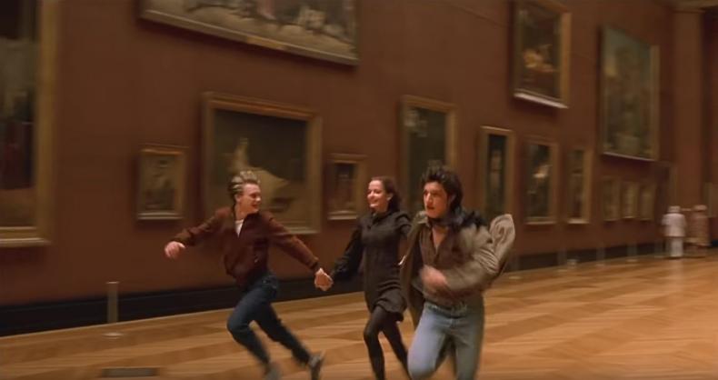 Das Kino als Tanz der Revolution - drängender und mächtiger als Gedichte, Gemälde und Theater - das ist Bertoluccis Anliegen. Eines Abends sitzt man in der elterlichen Wohnung beim Abendessen und diskutiert. „Ein Gedicht ist eine Petition, eine Petition ist ein Gedicht“, formuliert Theos und Isabelles Vater. Das sei, wie Theo spitz bemerkt, sein berühmtester Satz, der ihm Ansehen und Karriere verschafft habe. Im Louvre, die drei Protagonisten spielen BANDE Á PART (1964) nach, rennen sie mit Godards Film um die Wette durch die Ausstellungsräume: Fremdkörper in der Atmosphäre konzentrierter Sammlung vor dem musealen Kunstwerk. So schnell wie die Drei hineinrannten, sind sie auch schon wieder verschwunden. So oft sie ins Kino gingen, so oft verbringen sie nun Stunde um Stunde mit Diskussionen über Film und Politik in der Wohnung der verreisten Eltern. Die sexuelle Spannung steigt.